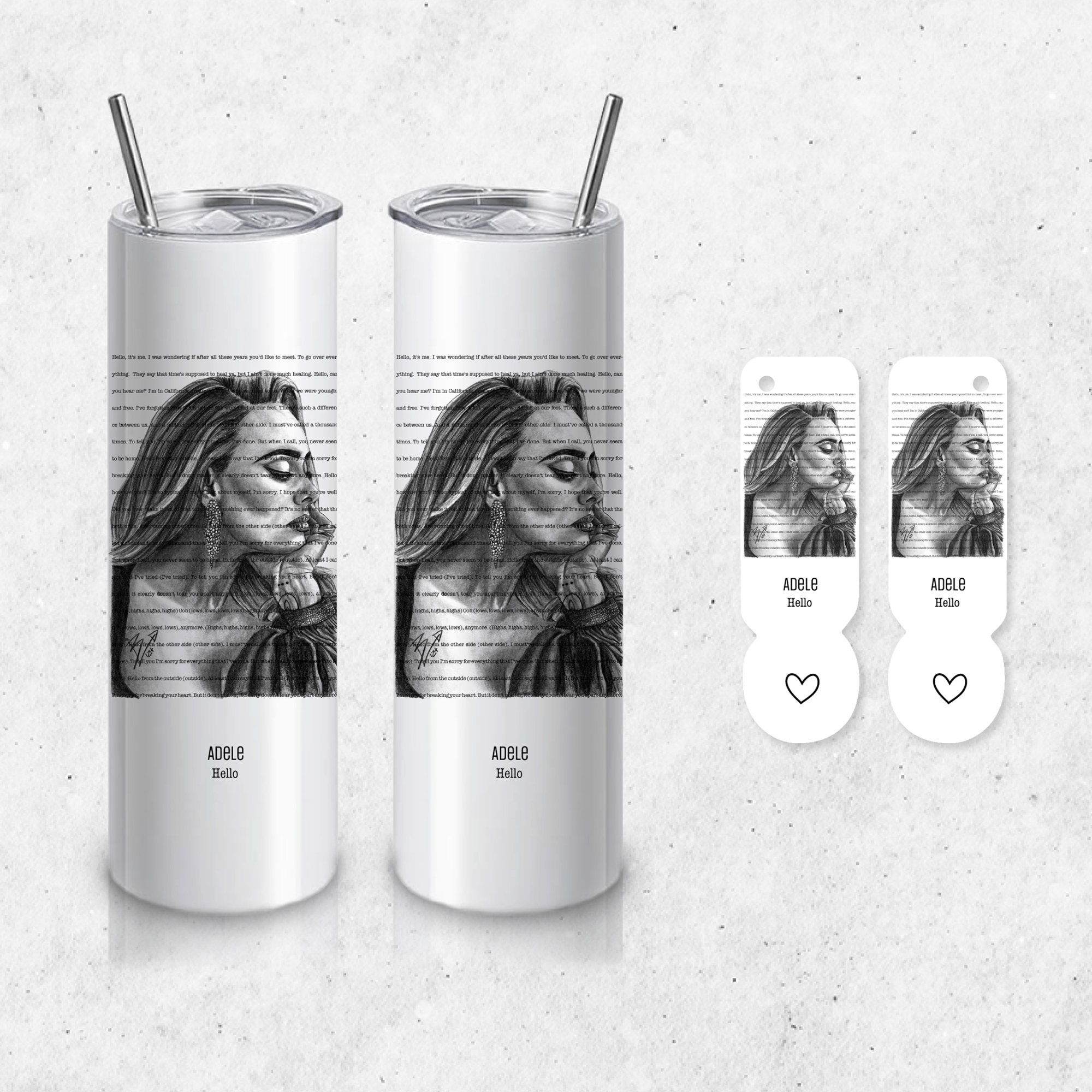 I am offering a package with a Thermo Mug (20 oz / 591 ml) and a shopping trolley solver with my drawings of Adele over her songs on both sides. (The picture is just an example.)